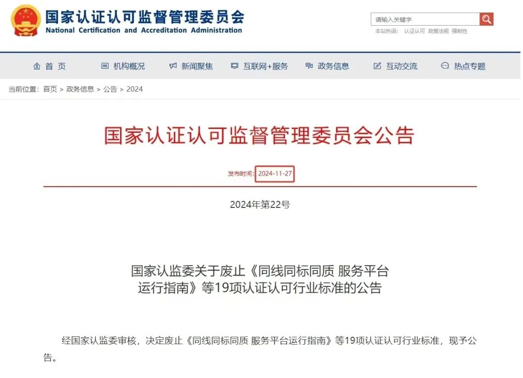 國家認(rèn)監(jiān)委關(guān)于廢止《同線同標(biāo)同質(zhì) 服務(wù)平臺運行指南》